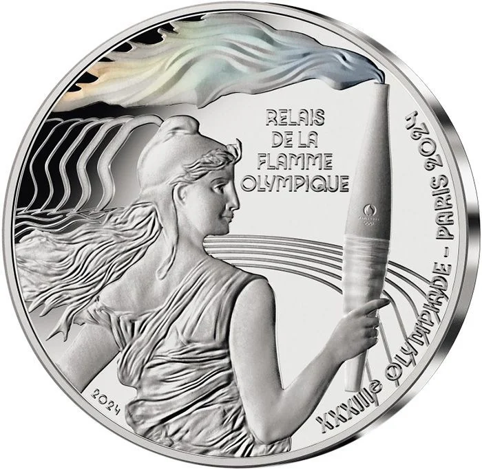 Marianne, symbol of the French Republic, strides forward holding the Paris 2024 Olympic torch. Its flame represents the athletes' spirit, with an athletics track extending behind her.