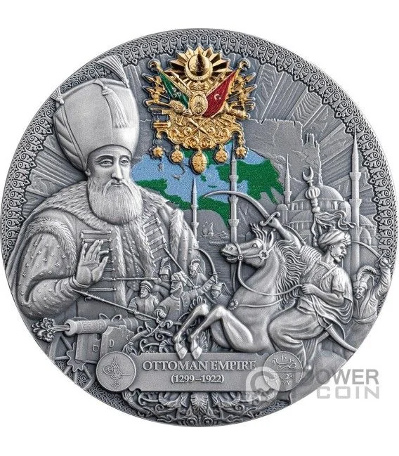 This coin's reverse features Sultan Suleiman the Magnificent with elite Janissaries, whose military prowess fueled Ottoman expansion. Below is inscribed "OTTOMAN EMPIRE 1299-1922."