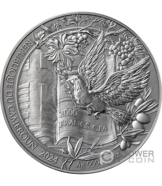 Description: Obverse: A dove with an olive branch, symbolizing peace and victory. Surrounding inscriptions: "REPUBLIQUE DU CAMEROUN," "2024," "Ag 999 2 OZ," and "2000 FRANCS CFA."