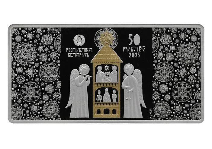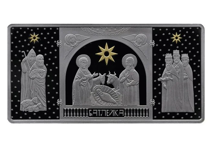 Description: A two-tier batley depicting a "King Herod" scene, flanked by instrument-playing angels. The coin's left and right fields are filled with stylized snowflakes.