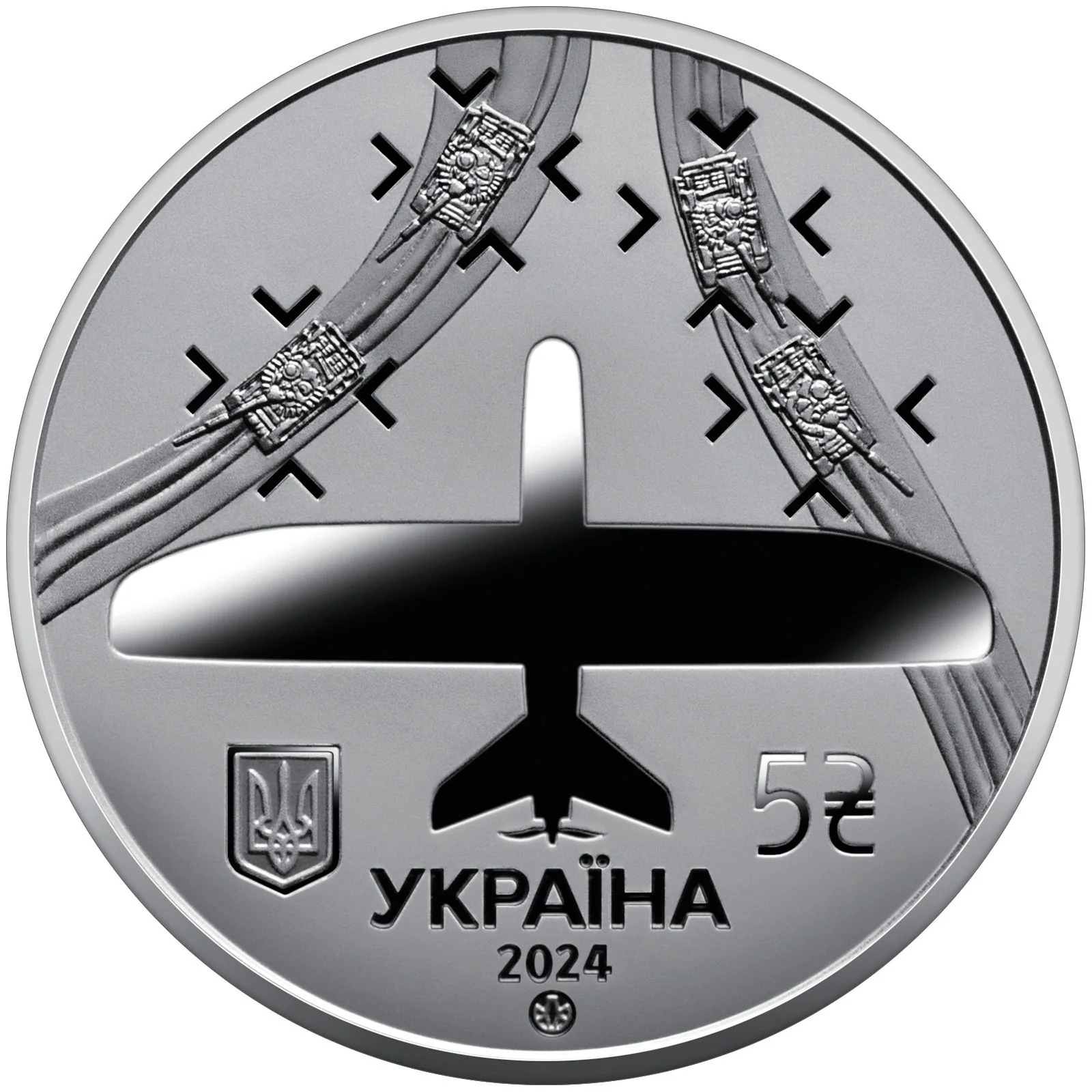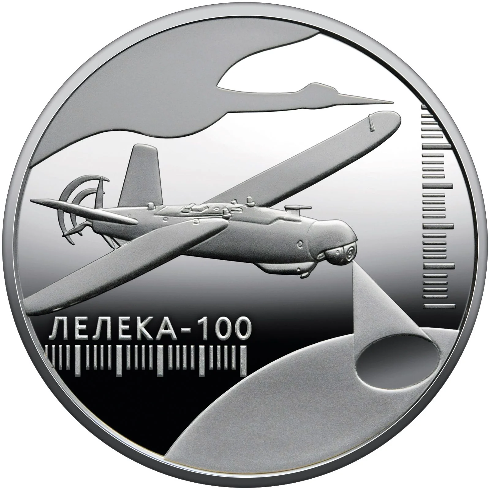 A Leleka-100 drone's monitor view shows detected enemy tanks on a steppe road. Below are Ukraine's coat of arms, the face value, the issue year, and the mint mark.