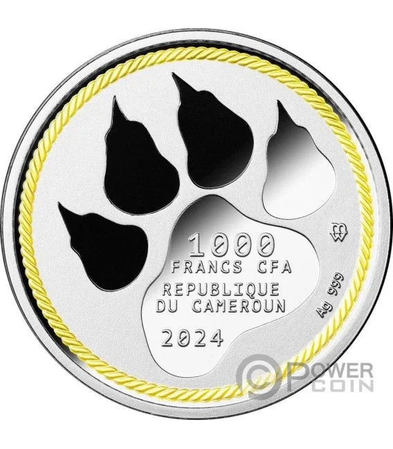 Description: The obverse features a large lion's paw, encircled by the inscriptions "1000 FRANCS CFA," "REPUBLIQUE DU CAMEROUN," "2024," and on the edge, "Ag 999."