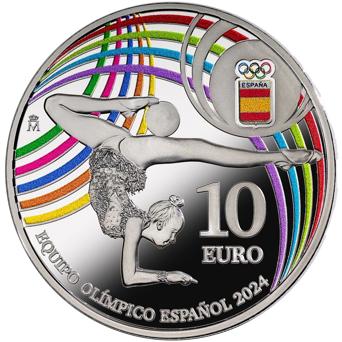 Gymnast with rhythmic gymnastic ribbons. Spanish Olympic Committee logo in upper right.