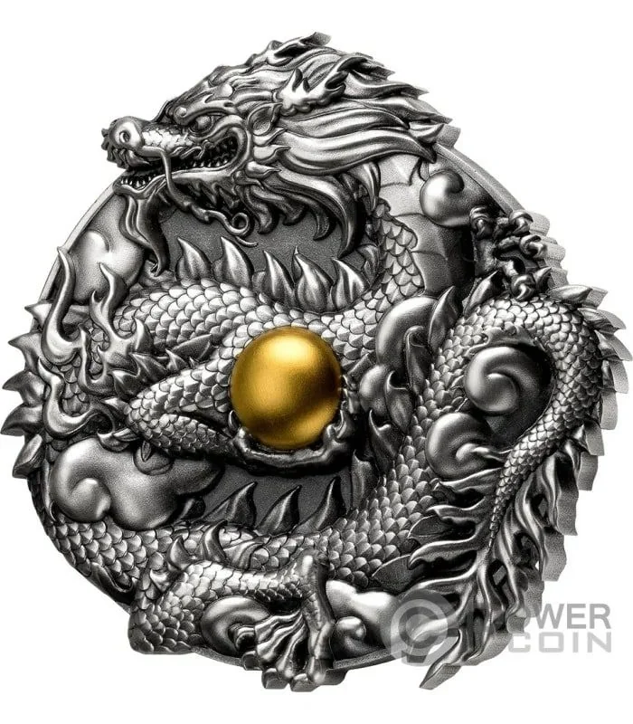 The reverse features a majestic dragon, a Chinese symbol of luck, strength, and power, centered around a gold-gilded sphere for a luxurious appearance.