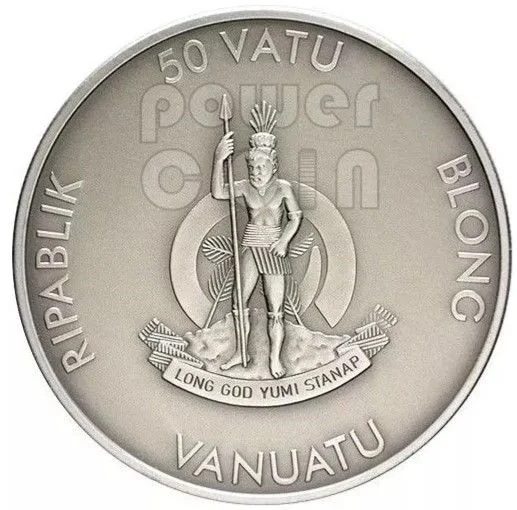 A Melanesian warrior before a curved boar's tooth, a scroll reading "LONG GOD YUMI STANAP," and the value.