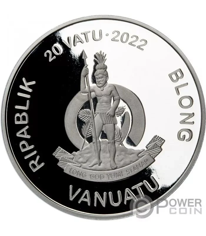 Description: Vanuatu's arms depict a Melanesian warrior before a curved boar's tooth, with a scroll reading "LONG GOD YUMI STANAP," the date, and the value.