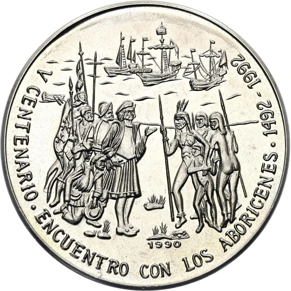Columbus meeting natives with ships behind. Curved legend notes event and dates. Mintmark and issue date below.