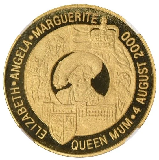 Queen Mother Elizabeth (center) with hat, encircled by a crown, Union Jack, childhood bust, wedding portrait with husband, adult bust, and a castle with coat of arms.