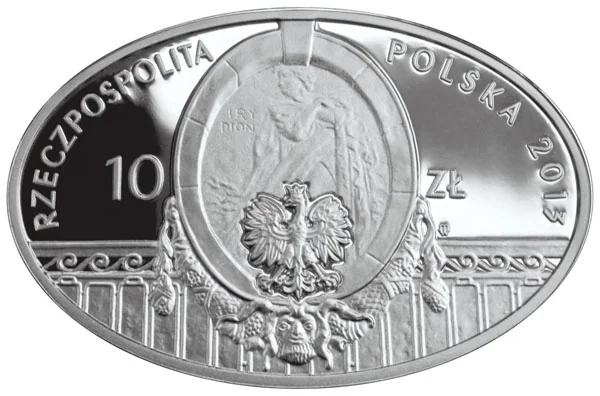 Central stylised bas-relief of Irydion from Warsaw's Teatr Polski, with Poland's Eagle emblem below. Flanked by "10-ZŁ", topped by "RZECZPOSPOLITA POLSKA 2013". Below the Eagle, a composition of a window frame and balcony balustrade. Mint mark M/W under "ZŁ".