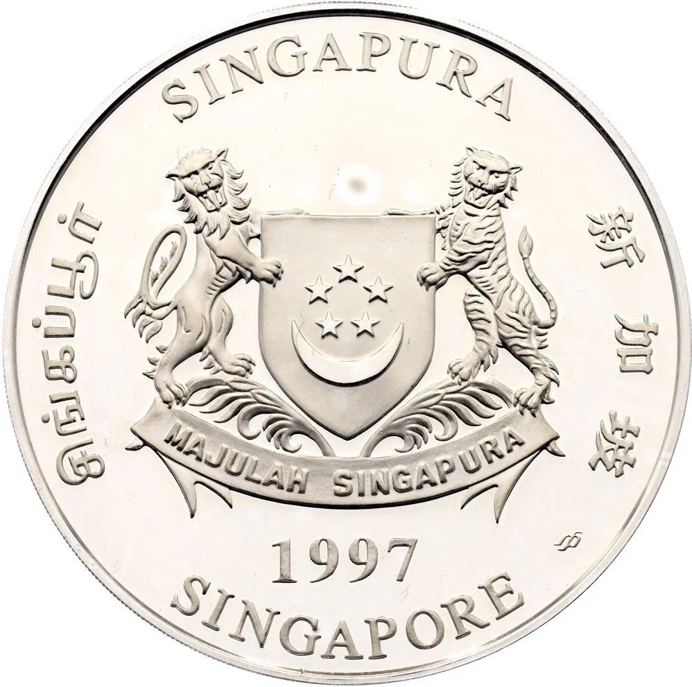 Emblem with date; 'Singapore' encircles it in English, Tamil, Chinese, and Malay.