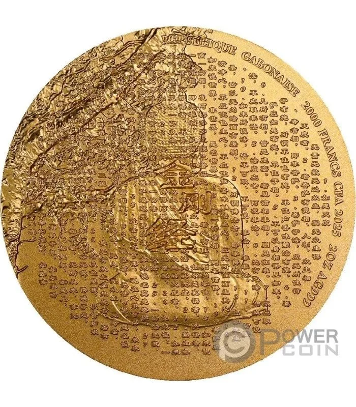 Description: The obverse features the Buddha's silhouette, the Bodhi tree, and a Sanskrit Sutra, along with the inscriptions: "REPUBLIQUE GABONAISE," "2000 FRANCS CFA," "2025," and "2OZ AG999."