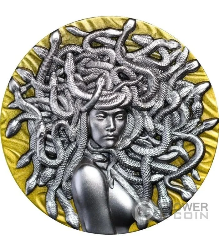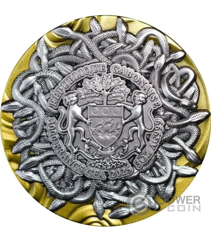 Description: Obverse: Medusa's snakes detail, Gabon's Coat of Arms, with inscriptions "REPUBLIQUE GABONAISE," "3000 FRANCS CFA," "2025," "3OZ Ag999."