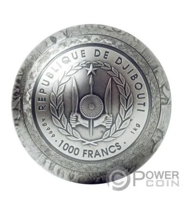 The obverse lower cap features Djibouti's coat of arms, encircled by the issuer name, fineness, value, and mass.
