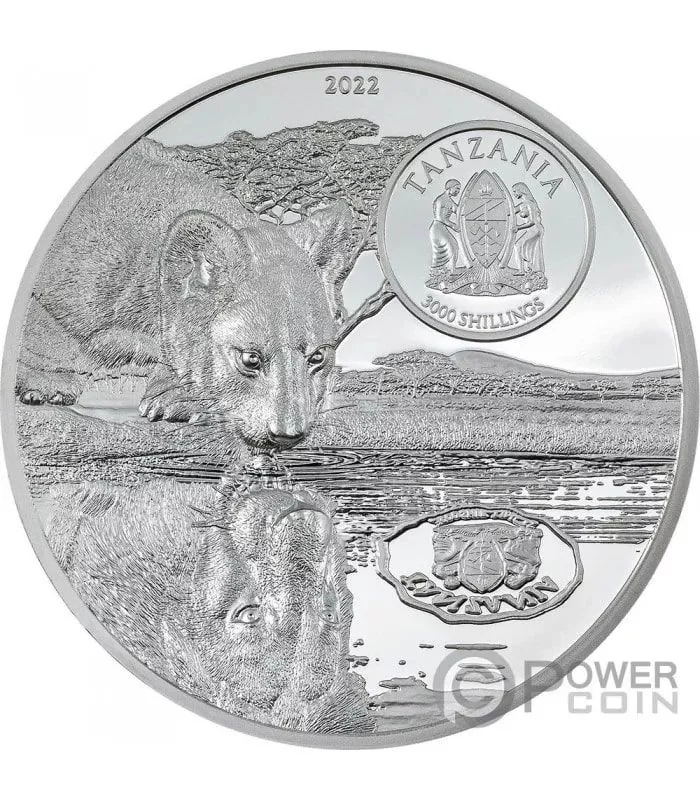 Description: The obverse features a lion cub drinking water, its reflection forming the Tanzanian Coat of Arms. Also inscribed are "TANZANIA," "2022," and "3000 SHILLINGS."