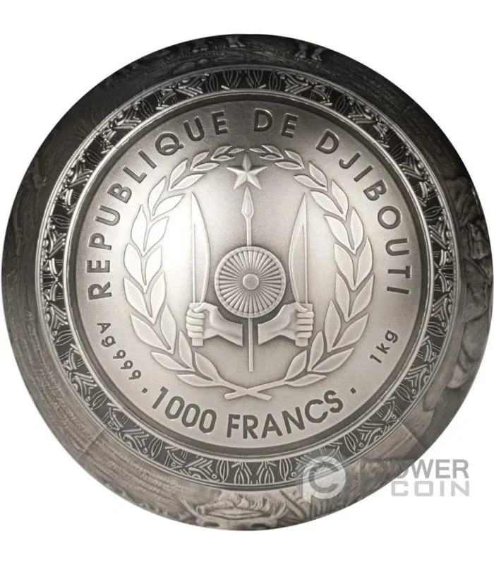 The obverse lower cap features Djibouti's coat of arms, encircled by the issuer name, fineness, value, and mass.