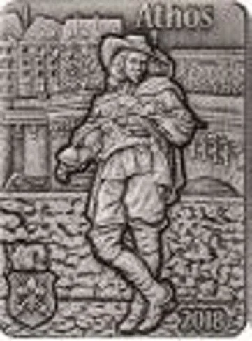 Athos poses before a building, bending a sword with his left hand. His name is top-left, a fleur-de-lys shield with crossed swords is bottom-left, and the date is bottom-right.