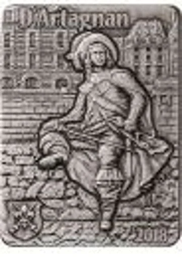 D'Artagnan sits on a low wall, sword resting on his knees, before a building. "D'Artagnan" is in the upper left, a fleur-de-lys shield with crossed swords is in the lower left, and the date is in the lower right.