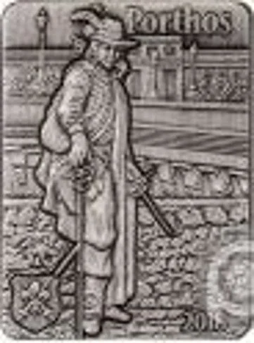 Porthos poses before a building, a sword in his right hand resting on the ground and a musket in his left. "Porthos" is in the upper left, a fleur-de-lys shield with crossed swords is in the lower left, and the date is in the lower right.