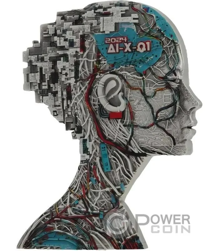 Description: The coin's obverse features Chad's Coat of Arms, inscribed with "REPUBLIQUE DU TCHAD," "2 OZ AG 999," and "10000 FRANCS CFA." Its antiqued finish and colorization highlight the intricate design.