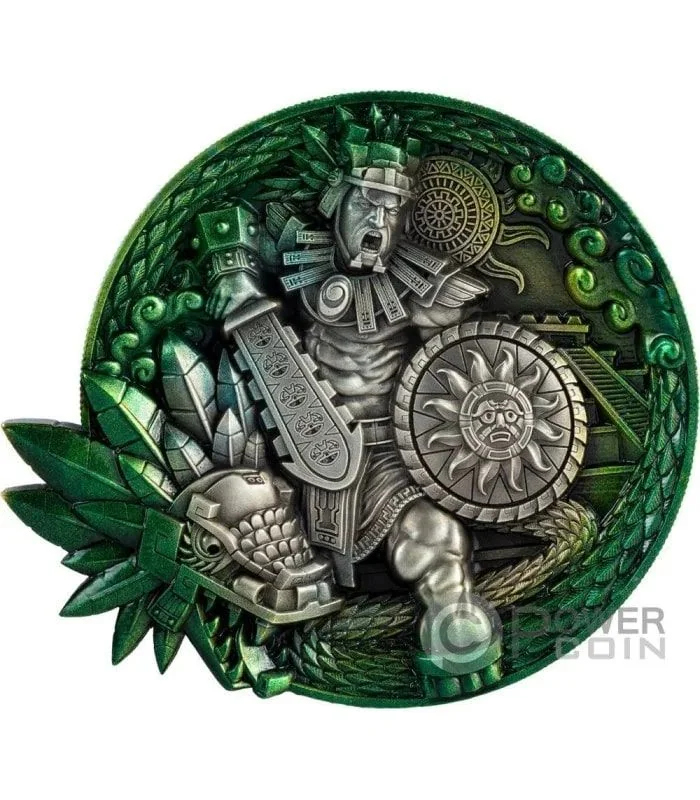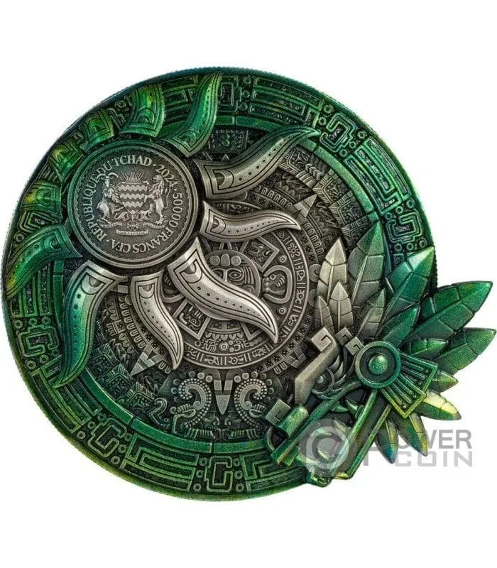 Description: An Aztec-style sun decoration featuring Chad's Coat of Arms, inscribed with "REPUBLIQUE DU TCHAD," "2024," and "50000 FRANCS CFA."