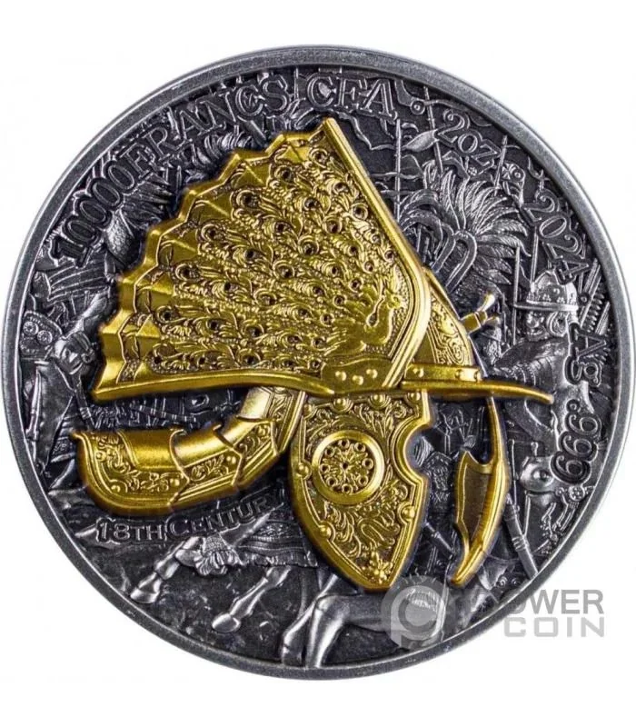 Description: The reverse depicts an ornate 18th/19th-century hussar helmet, with battle scenes in the background. Inscriptions note "10000 FRANCS CFA," "2024," "2 oz Ag.999," and "18TH CENTURY."
