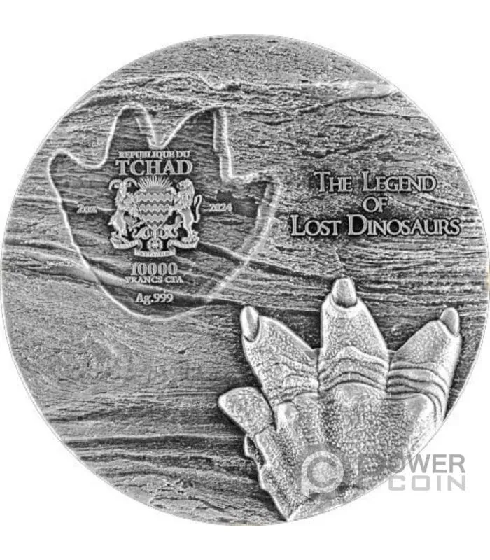 Description: Chad's coat of arms and a dinosaur paw, with inscriptions: "REPUBLIQUE DU TCHAD," "10000 FRANCS CFA," and "THE LEGEND OF LOST DINOSAURS."