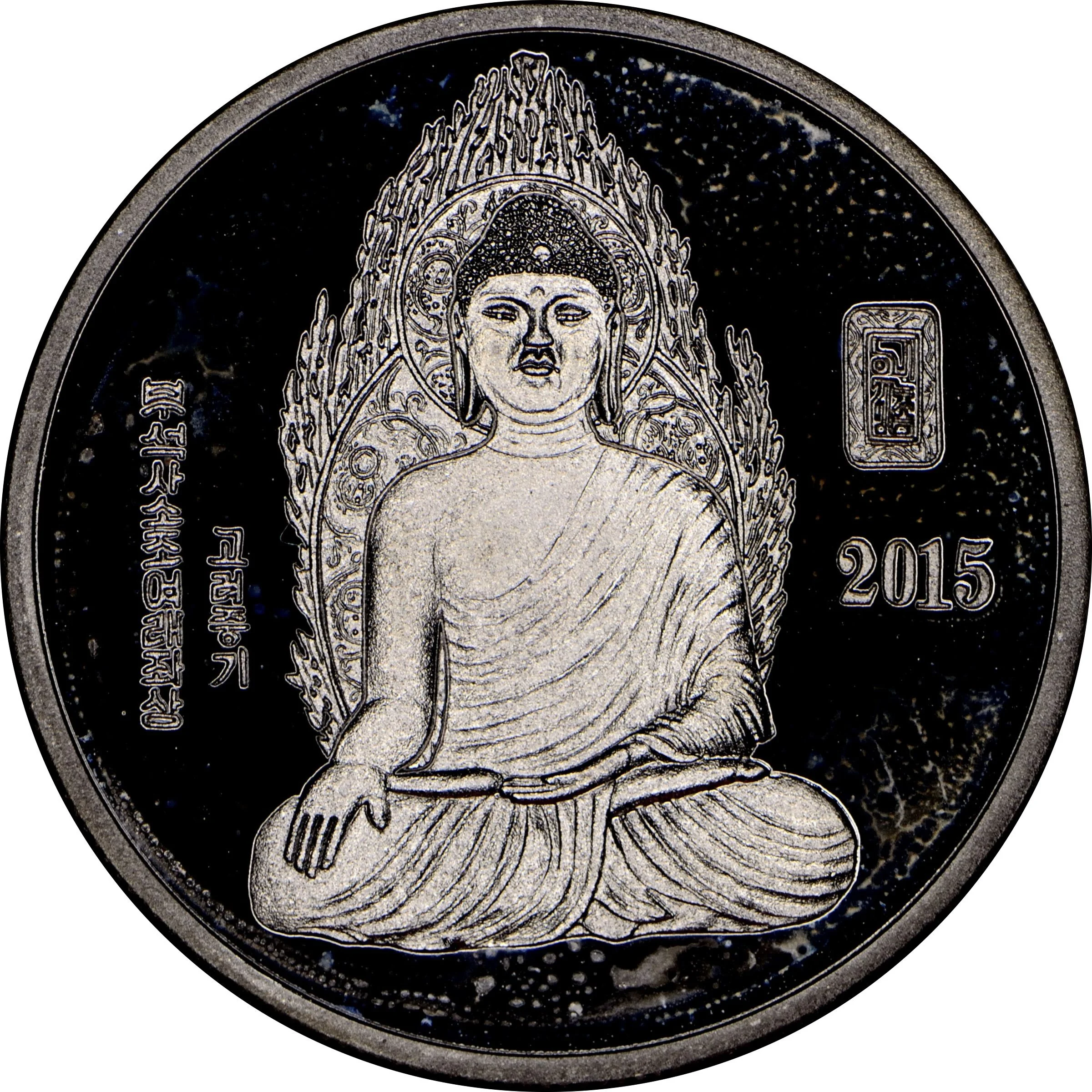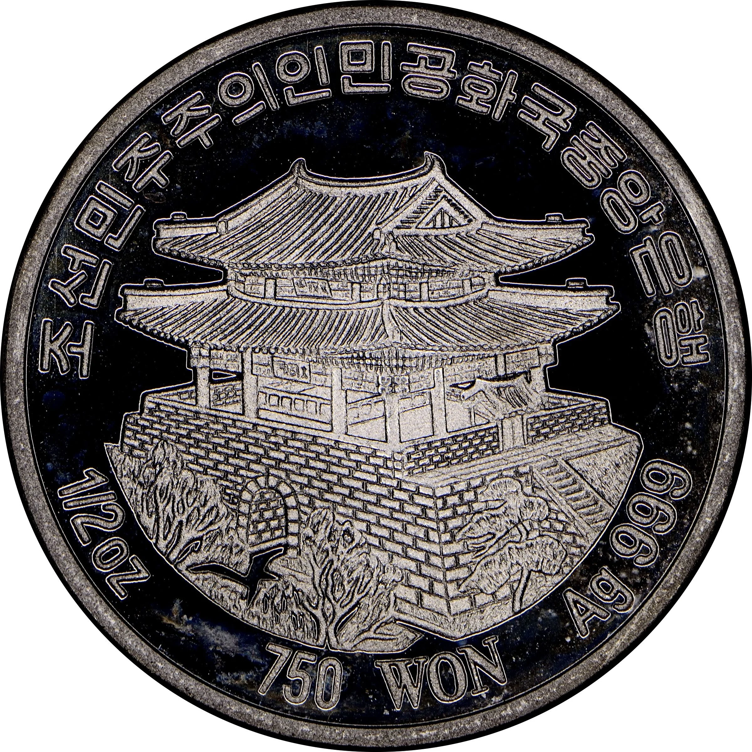 Description: Taedong Gate, Pyongyang's eastern gate, is centered. Hangul text is above; weight, denomination, and purity are below.