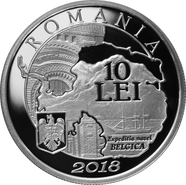 Foreground: vintage image of the Belgica Antarctic expedition ship with "Expeditia navei BELGICA". Background: partial image of Emil Racoviță's Speleology Institute in Cluj. Also features arched "ROMANIA", "10 LEI", Romania's coat of arms, and "2018".