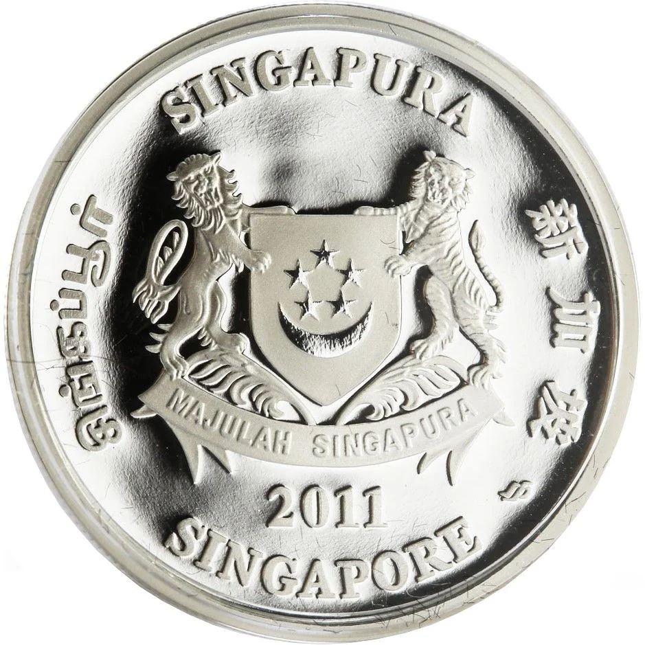 Emblem with date; 'Singapore' encircles it in English, Tamil, Chinese, and Malay.