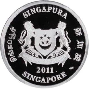Emblem with date; 'Singapore' encircles it in English, Tamil, Chinese, and Malay.