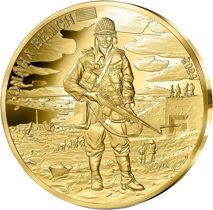 An American soldier at Omaha Beach's center, with a bunker to the right and troops landing to the left.