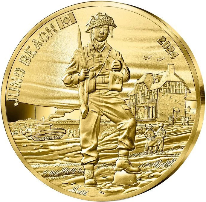 A Canadian soldier stands on a beach, flanked by a Churchill tank and a traditional Côte de Nacre house.