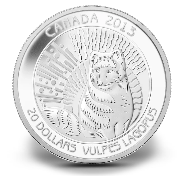 Engraved Canadian Arctic Fox. Edge inscribed with its Latin name, VULPES LAGOPUS, country, year, and value.
