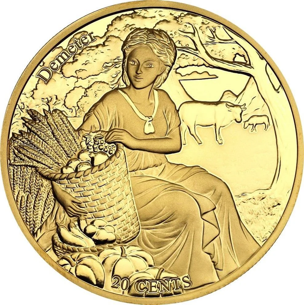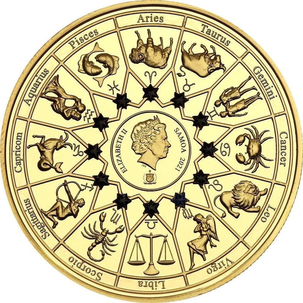 Description: A circle surrounds Queen Elizabeth II's portrait, with a small Samoan coat of arms below. The 12 zodiac signs and symbols are depicted, each with a black star-shaped crystal insert; Virgo's is blue.
