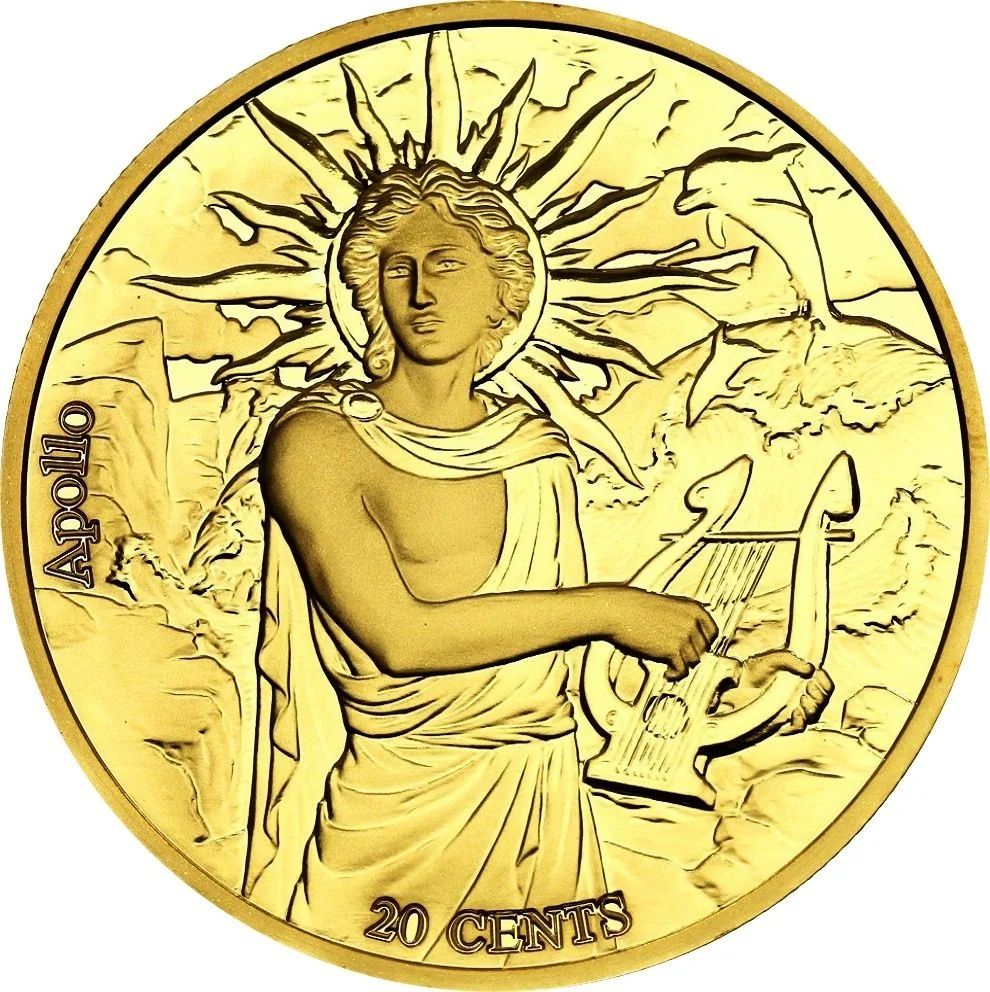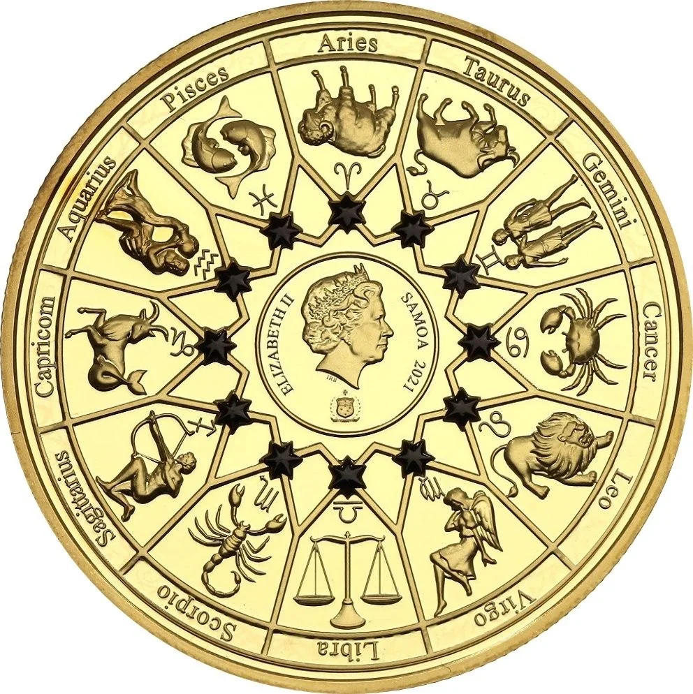Description: A circle surrounds Queen Elizabeth II's portrait, with a small Samoan coat of arms below. The 12 zodiac signs and symbols are depicted, each accompanied by a black star-shaped crystal insert, except for Gemini, which has a grey one.