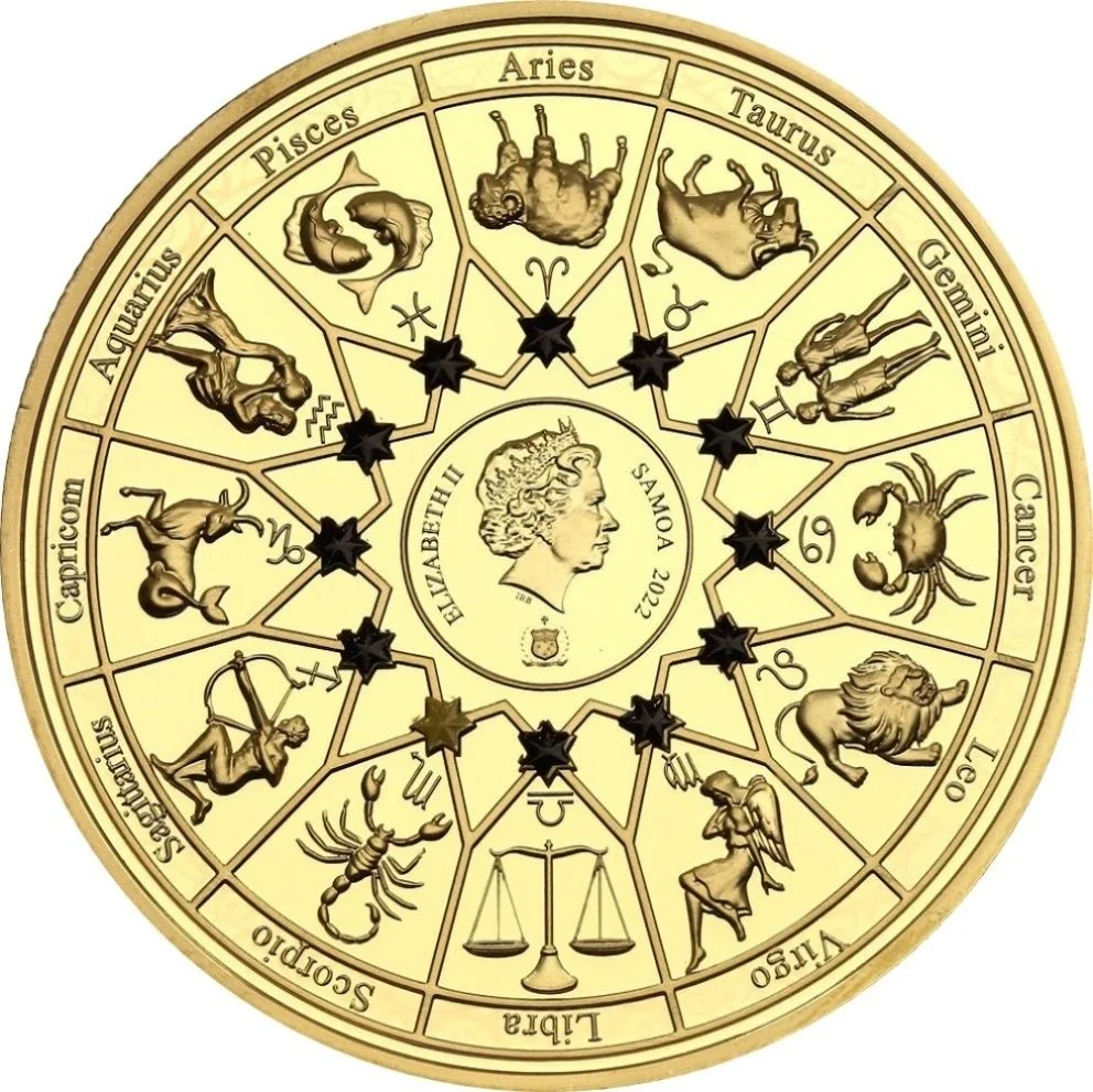 Description: A circle surrounds Queen Elizabeth II's portrait, with a small Samoan coat of arms below. Twelve zodiac signs, each marked by a black star-shaped crystal, are depicted; Scorpio's symbol is accompanied by a yellow crystal.