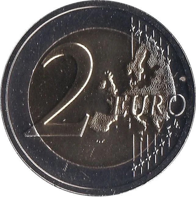A Western Europe map spans the coin's right side, with "2 EURO" overlaid—the "2" in the Atlantic. Twelve stars flank the map, six above and six below, connected by six vertical stripes across the inner core.