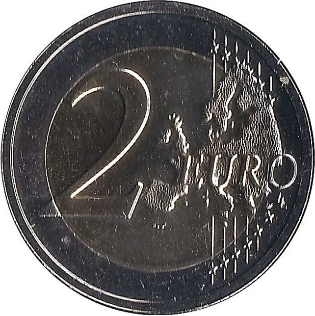 A Western Europe map spans the coin's right side, with "2 EURO" overlaid—the "2" in the Atlantic. Twelve stars flank the map, six above and six below, connected by six vertical stripes across the inner core.