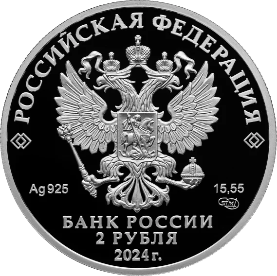 The obverse features the Russian Federation coat of arms, inscriptions for "RUSSIAN FEDERATION" and "BANK OF RUSSIA," the denomination "2 ROUBLES," the issue year "2024," the metal's chemical symbol, fineness, mint mark, and fine metal content.