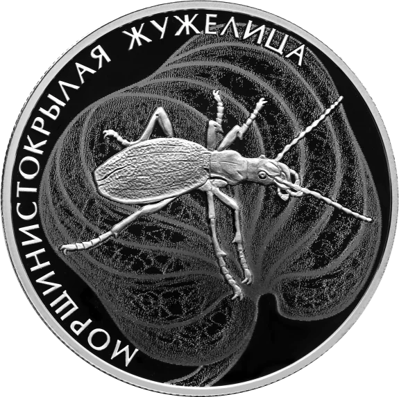 The coin's reverse has a laser-treated matte relief of a wrinkled ground beetle on a plant, with the inscription ‘МОРЩИНИСТОКРЫЛАЯ ЖУЖЕЛИЦА’ around the upper left circumference.