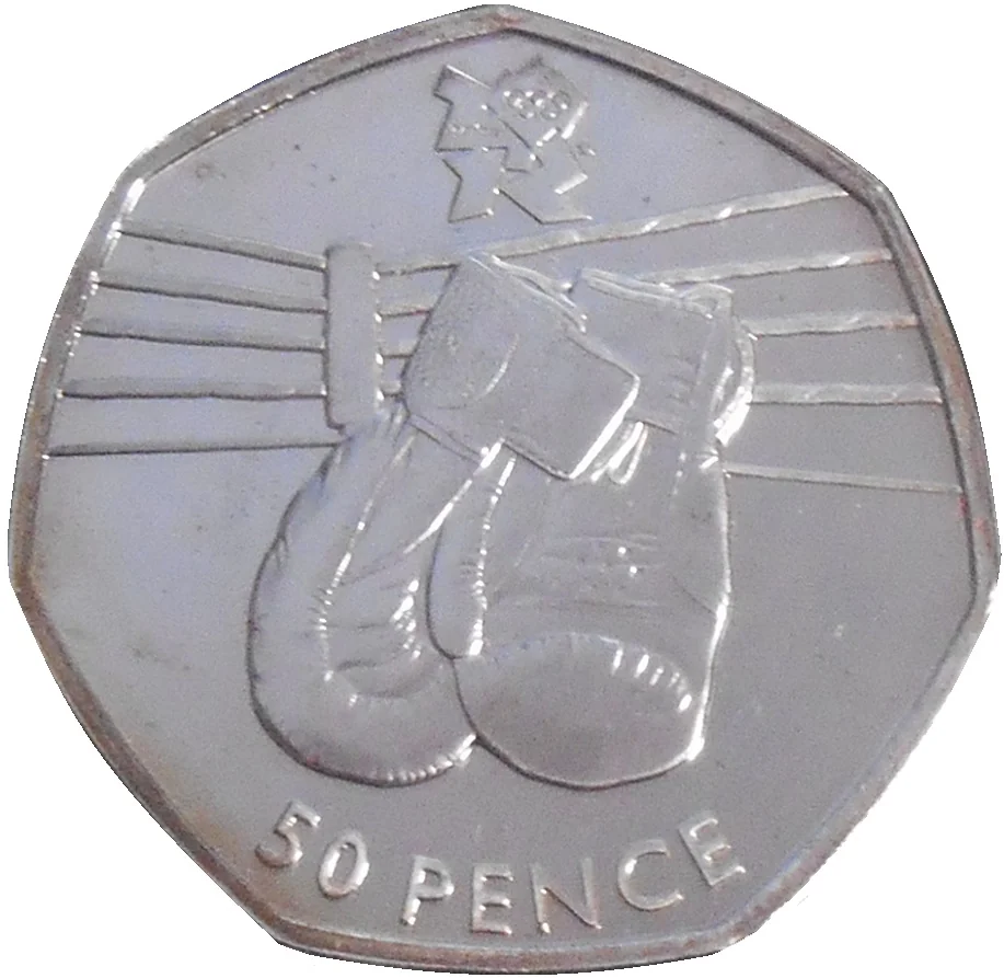Boxing gloves in a ring with the London 2012 logo above and denomination below.