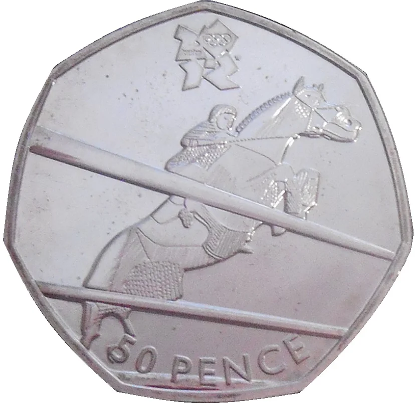 Equestrian jumper over fence with London 2012 logo above and denomination below.