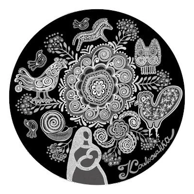 Central stylized images of flowers, animals, and a mother with a child, above the inscription: KALYKHANKA.