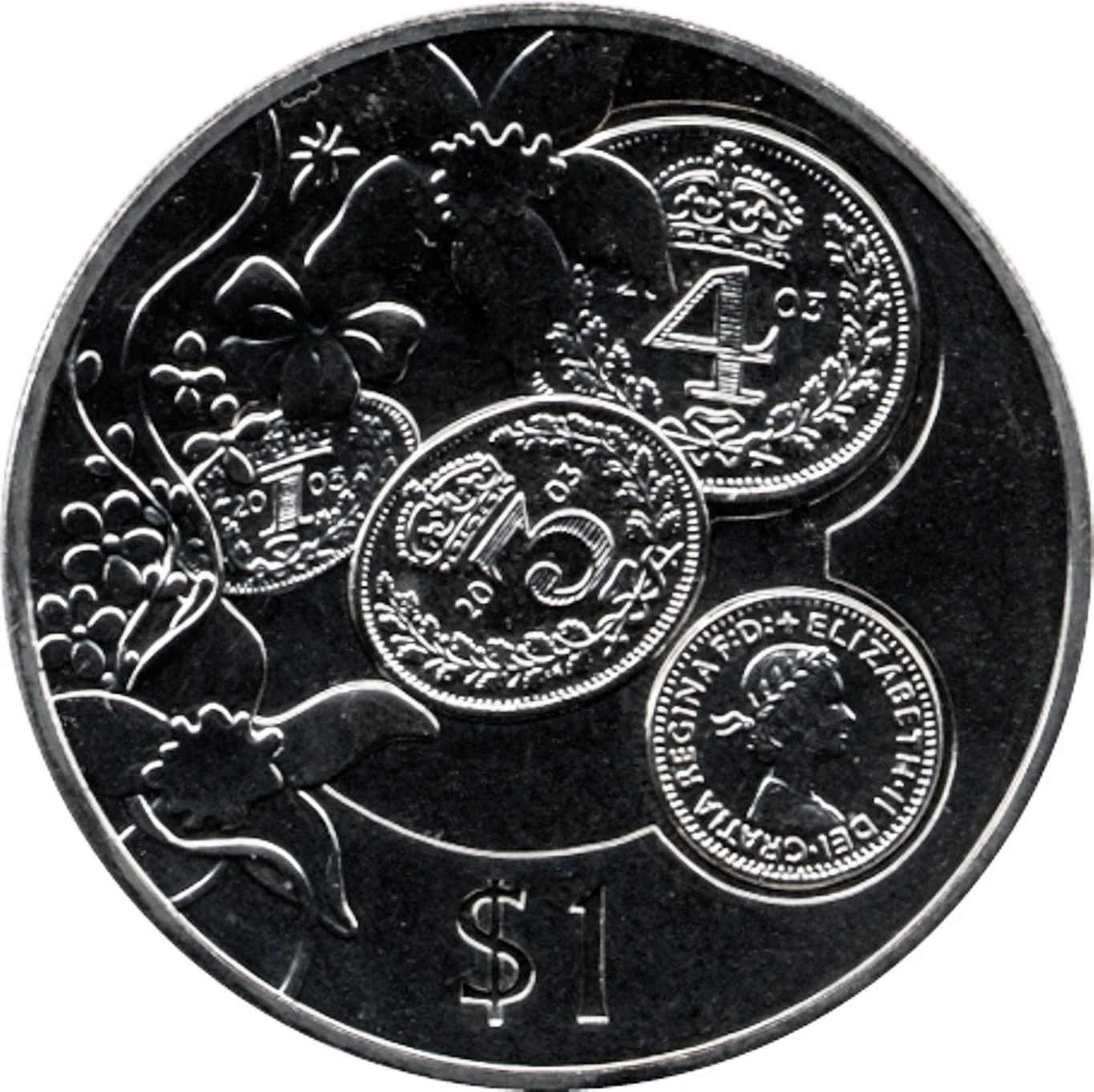 Four 2003 Elizabeth II coins among flowers.
