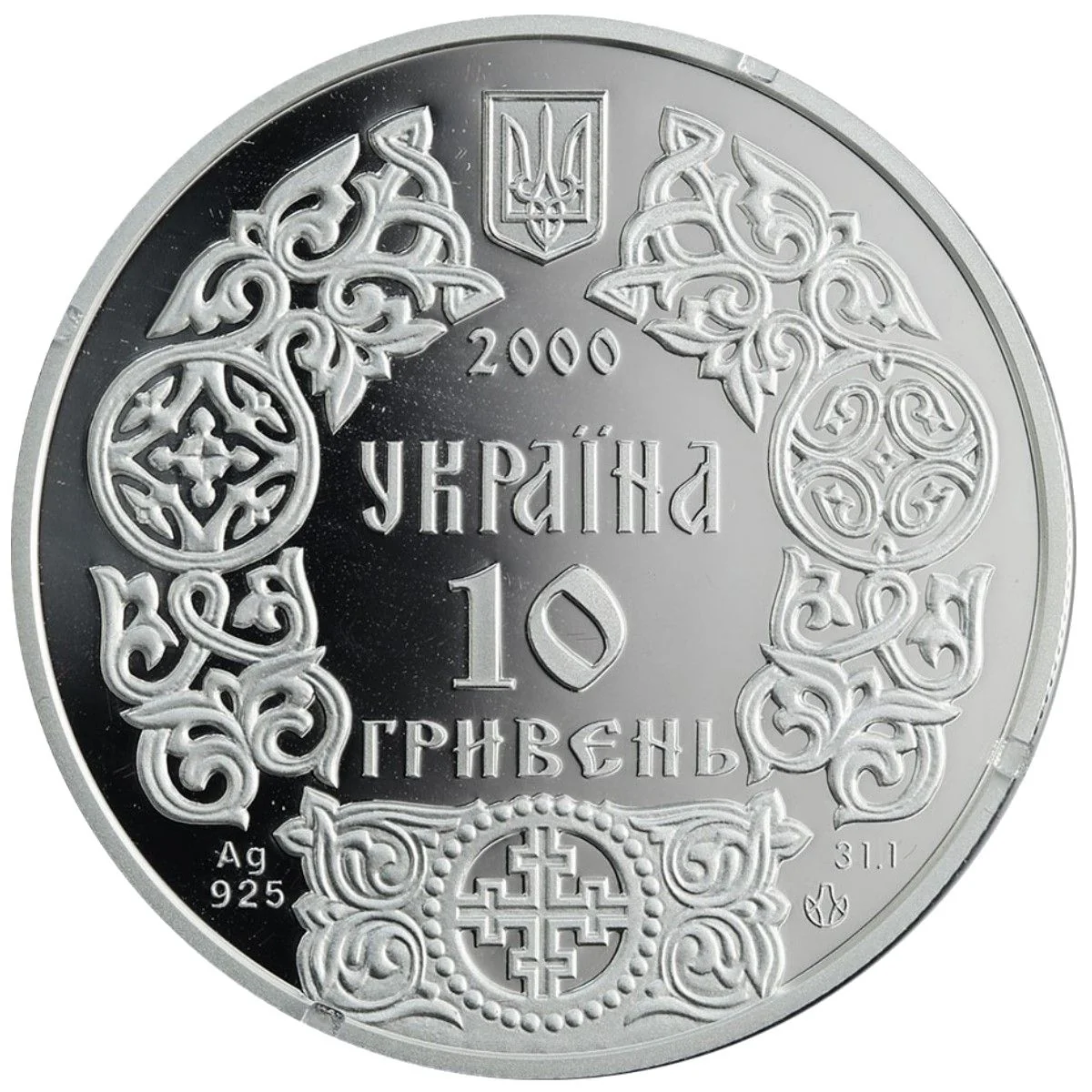 Description: The small National Emblem of Ukraine and the inscription "2000 / УКРАЇНА / 10 / ГРИВЕНЬ" are set within an old-Rus ornamental pattern. Also included are the metal fineness (Ag 925), the weight in fineness (31.1), and the Mint of the National Bank of Ukraine logotype.