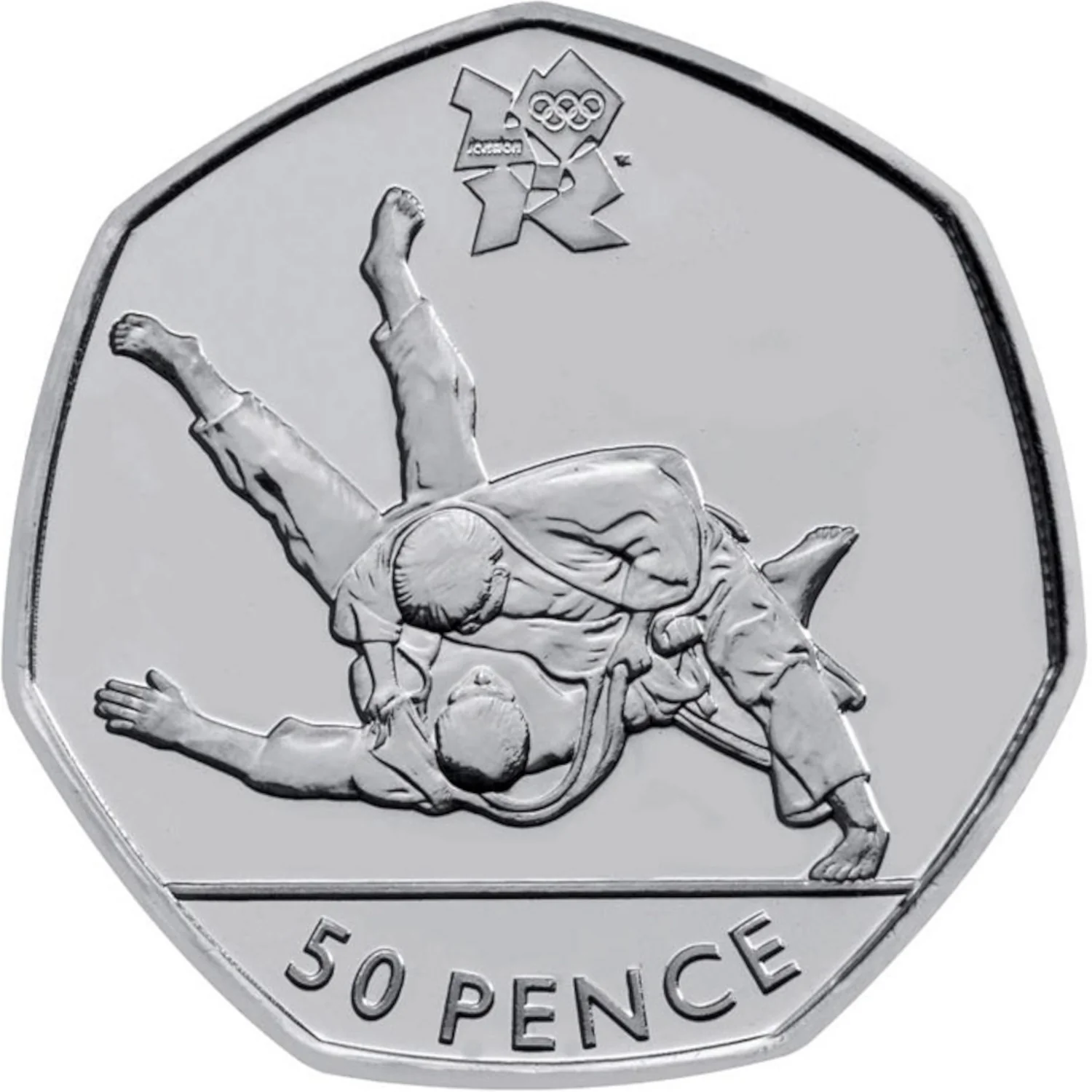 Two judo athletes competing, with the London 2012 logo above and the denomination below.