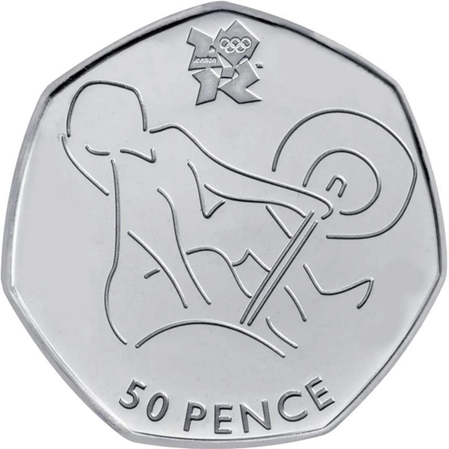 Weightlifter in action with London 2012 logo above and denomination below.