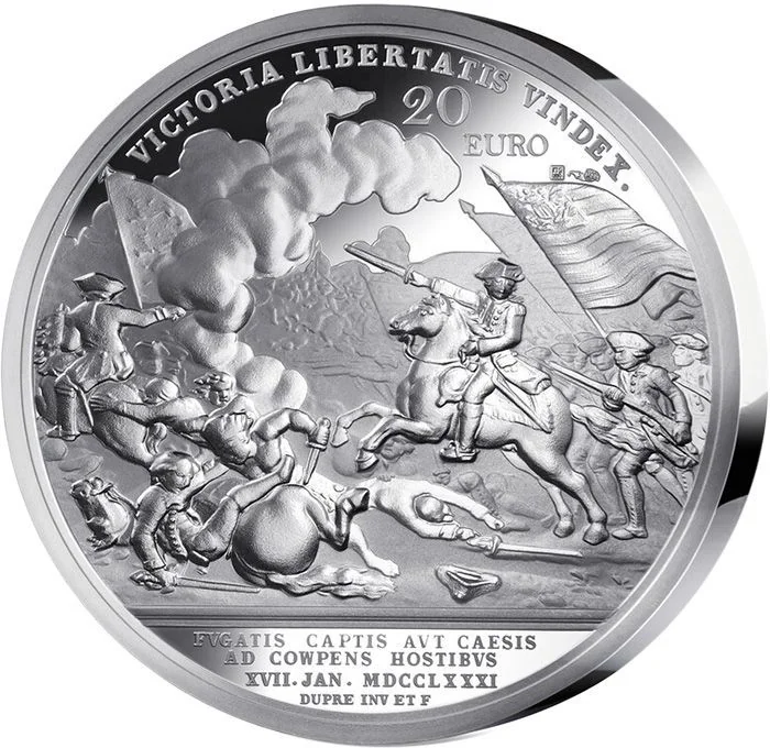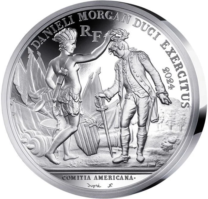 Daniel Morgan's victory allegory, with America depicted as a feathered, armored queen. "RF" and the date are added to the original medal.