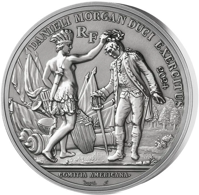 Daniel Morgan's victory allegory, with America depicted as a feathered, armored queen. "RF" and the date are added to the original medal.