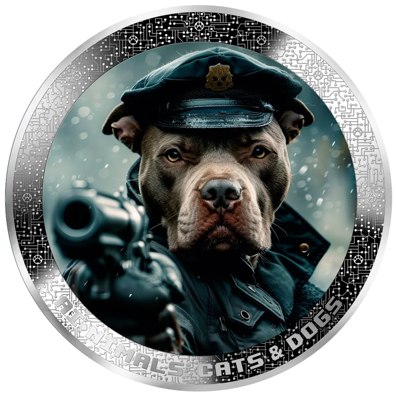 AI-colourized image of an anthropomorphic police dog aiming a revolver.